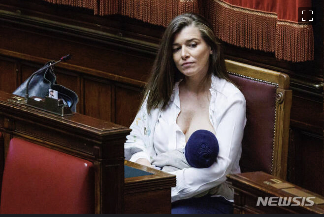 (본문 내용 ) 이탈리아 최초 오성운동당의 질다 스포리티 엘로 의원이 7일 로마하원에서 입법 투표가 진행되는 동안 생후 2개월 된 아들에게 모유수유를 하고 있는 모습.. 스포리티 엘로 의원은 의회에서 처음으로 모유수유를 한 의원이 되었고 여러 의원으로부터 박수를 받았다고 한다.